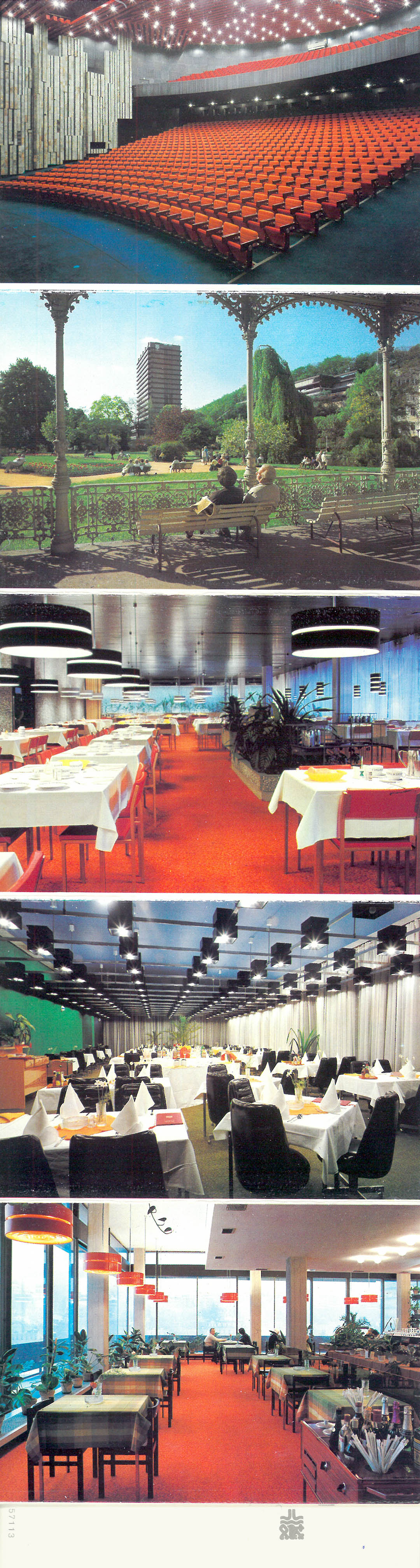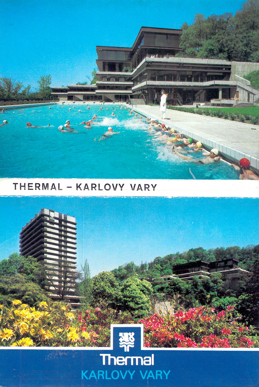 The Thermal Hotel complex in the spa center of the city Karlovy Vary is considered an extraordinary achievement of 1960s Czechoslovak architecture. It was conceived of by its creators as a center for the famous International Film Festival that would be open to the city. One of the pinnacles of domestic Brutalism, it is in its essence a total work of art, in which diverse artistic disciplines from architecture to design to typography and fine art complement each other harmoniously.